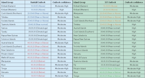 NOTE: Rainfall and sea surface termperature estimates for Pacific Islands for the next three months are given in the tables above. The tercile probabilities (e.g., 20:30:50) are derived from the averages of several global climate models. They correspond to the odds of the observed rainfall or sea surface temperatures being in the lowest one third of the distribution, the middle one third, or the highest one third of the distribution. For the long term average, it is equally likely (33% chance) that conditions in any of the three terciles will occur. *If conditions are climatology, we expect an equal chance of the rainfall being in any tercile.