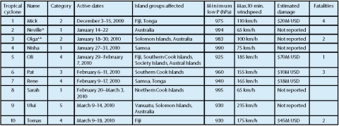 In the Southwest Pacific sector covered by the ICU forecast, 10 TCs were documented for the 2009/10 season. The onset of the season did not occur until early December 2009. All of the storms that occurred during the first two months of the season (about half of the total for 2009/10) achieved only a Category 1 or 2 status. In contrast, the back half of the TC season saw the development of four systems that reached or exceeded a Category 3 status. Two Category 4 storms had winds in excess of 160km/h (Oli and Rene), and one event had 10-minute sustained winds in excess of 200km/h (Ului).