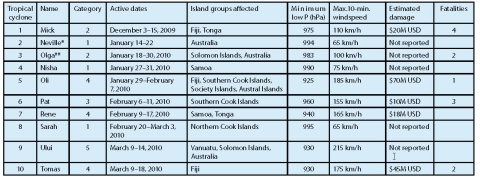 Documentation of the TC activity during the 2009/10 season has been coalated from reports issued by the Regional Specialised Meteorological Centre in Nadi, Fiji, the Joint Typhoon Warning Centre at Pearl Harbour, Hawaii, the Tropical Cyclone Warning Centre based at the New Zealand Meteorological Service in Wellington, and the Australia Bureau of Meteorology, and are tabluated below.
