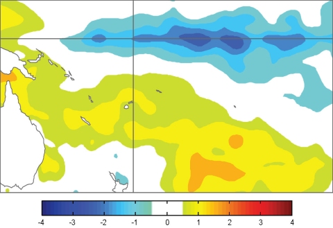 There is enhanced convection over Indonesia and much of northern Australia. Convection remains suppressed along the Equator in the western and central Pacific. Easterly trade winds are stronger than normal west of about 160°W, and the ITCZ and SPCZ are both poleward of their normal positions. The SOI has been near or above +2.0 for the past three months (+2.5 for September, +2.1 for JAS)). The TRMM ENSO index is –1.4 for September, which is slightly weaker than the August value of –1.9 (values of -1.0 or less are considered typical of La Niña conditions). Sea surface temperatures show a cold tongue extending along the Equator from 160°E eastwards, with positive SST anomalies in the far western Pacific and in the extra–tropics of both hemispheres. The NINO3 and NINO4 anomalies have both intensified from August, and are now around –1.2°C for September (wth a JAS average of –0.8°C). Sub–surface ocean temperatures exhibit a strong negative heat content anomaly of about –5°C to the east of the Date Line, centred near 140°W and 100 m depth. This anomaly is more intense and 10° further east compared to last month. The MJO is currently very weak and projections are unreliable.