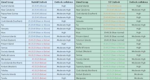 The ensemble of global models show a weakening of the near equatorial Pacific sea surface temperature cold anomalies in the coming months, and contraction cold waters that exist west of the International Dateline. Above average SSTs are forecast for the Austral Islands and New Caledonia. Average or above average sea surface temperatures are forecast for Papua New Guinea, Vanuatu, Tonga, Fiji, and the Southern Cook Islands. Near normal or below normal SSTs are forecast for Tuvalu, Wallis & Futuna, Western Kiribati, Samoa, the Society Islands, Tokelau, and the Tuamotu Archipelago. Eastern Kiribati, the Northern Cook Islands and the Marquesas are expected to experience below normal SSTs. Near normal SSTs are forecast for Niue, Pitcairn Island and the Solomon Islands.
