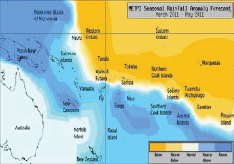 During March – May 2011, a region of suppressed convection is likely in the southwest Pacific encompassing Tuvalu, Tokelau, Western Kiribati, the Tuamotu Archipelago, the Marquesas and the Northern Cook Islands. Below average rainfall is expected for those island groups. Average or below average rainfall is expected for Pitcairn Island, the Society Islands, Wallis & Futuna, Samoa, and Eastern Kiribati. Enhanced convection is likely along the Southwest Pacific Convergence Zone, which is expected to be displaced to the southwest of normal. Papua New Guinea, New Caledonia, Tonga, and the Austral Islands are expected to receive above normal rainfall for the coming three month period. Near or above average rainfall is forecast for Niue, the Solomon Islands, Vanuatu, Fiji, and the Southern Cook Islands