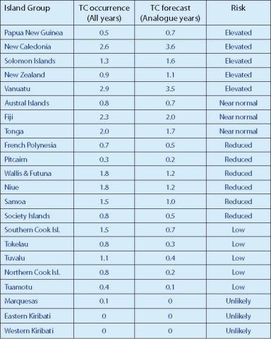 Each year, TCs have a significant impact on the southwest Pacific. Projections continue to show an increased risk of TCs for the remainder of the 2010–11 season over the Coral Sea and to the southwest of Fiji, particularly for Papua New Guinea, the Solomon Islands, Vanuatu, and New Caledonia. New Zealand is also at higher risk of experiencing an ex-tropical cyclone interaction, even late in the season. While risk is generally reduced for islands to the east of the International Date Line during La Niña, historical cyclone tracks indicate that TCs can affect parts of southwest French Polynesia, including the Society and Austral Islands, and the Cook Islands during La Niñas. All islands should remain vigilant as La Niña continues to evolve with progression through austral autumn. The analogue years used in the 2010–11 forecast indicate the TC season may also extend into May, while the forecast update issued in February indicated that the season total would approach at least 12 named TCs.
