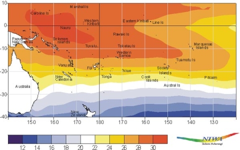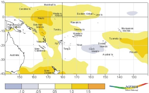 SST anomalies have still shown little change since July, with an area of warm 30°C surface waters and positive SST anomalies (at least 1.0°C above average) between the Solomon Islands and Western Kiribati. SST anomalies also continued 1.0°C or more above average about and to the east of the Tuamotu Islands. A tongue of cooler equatorial waters remains off the South American coast, enhancing the east-west temperature gradient somewhat. Eastern equatorial SSTs are expected to stay in the neutral range into 2002. The October Southern Oscillation Index (SOI) averaged -0.3; the 3-month mean was �0.4, with trade winds remaining slightly enhanced east of the Dateline in the central equatorial Pacific.