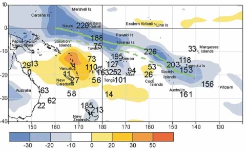 Very active SPCZ brings high rainfall to many islands Low rainfall from coastal Queensland in Australia, across to Vanuatu