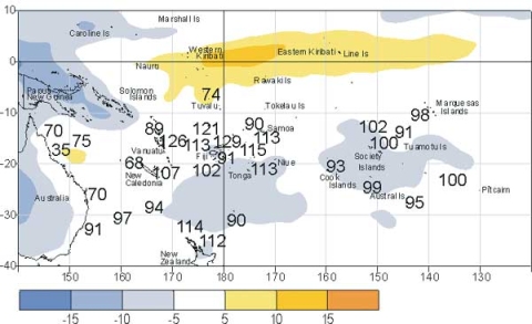 A noticeable shift from below to above average SSTs occurred from June onwards over Kiribati, with a return to neutral ENSO conditions. Mean air temperatures were 0.3 to 0.5°C above normal for the year in New Caledonia, Fiji, Tuvalu, Tonga, and parts of Vanuatu, and near average elsewhere.