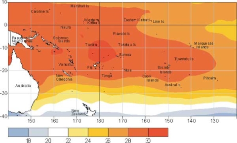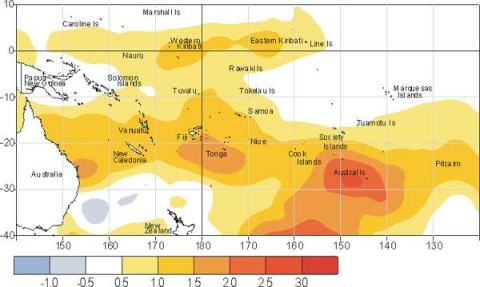 In the tropical Southwest Pacific, a very extensive area of much warmer than usual water at the surface (at least 1.0°C above average) extends from the Coral Sea right across to the region well east of Pitcairn Island, encompassing most islands between 15 and 25°S. The warmest surface waters (30-31°C) surround the Solomon Islands and an area further east between Tuvalu and Samoa. A region of positive SST anomaly (also at least 1°C above average) is well established about the date line (around Kiribati) in the Equatorial Pacific. Negative temperature anomalies continue east of about 150°W, but have weakened since January. Sub-surface sea temperature observations show a very strong positive anomaly (centred at 100-120°W at 50 m depth) in the eastern Pacific, and positive anomalies have broken through to the surface between South America and 100°W over the past few weeks. Most global SST forecast models indicate that the El Niño-Southern Oscillation (ENSO) climate pattern is expected to remain in a near-neutral phase for the next three months. However, an "alert" is in place as there is a possibility that warm ENSO conditions could develop by spring, although it remains too early to make a confident prediction as forecast confidence remains low at this time of year. The Southern Oscillation Index (SOI) has been weakly positive for the past two months, because of above average pressures in Tahiti. The 3-month mean of -0.1 is still neutral, with no sign yet of a negative trend. The trade winds continued to be slightly enhanced in the central Equatorial Pacific, with westerly anomalies in the west (due to a westerly wind burst toward the end of February, although not as strong as the one during December).