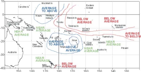Broad-scale rainfall patterns and anomalies in the southern tropical Pacific area estimated from the state of large-scale regional climate factors, such as La Niña or El Niño, their effect on the South Pacific and Tropical Convergence Zones, surface and sub-surface sea temperatures, and computer models of the global climate. Rainfall estimates for the next three months for Pacific Islands are given in the adjacent table. The terciles (e.g. 20:30:50) are derived from the interpretation of several global climate models. They correspond to the lowest (driest) one third of the rainfall distribution, the middle one third, and the highest (wettest) one third of the distribution. On the long-term average, rainfall is equally likely (33% chance) in any tercile. The probabilities shown express the expected shift in the distribution from the long-term average, based on predictions of oceanic and atmospheric conditions. The amount of inter-model forecast consistency is indicated by the levels of confidence expressed in the table.