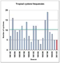 The number of Southwest Pacific tropical cyclones 2001/02 season compared to frequencies during the past 20 years - Click to enlarge
