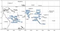 | Vicki | 12°S 158°W | 22-28 Dec. | 65 | Tropical Cyclone |