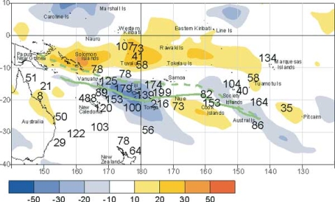 The SPCZ was displaced further south than average about and west of the date line, with a large area of enhanced convection affecting Fiji and Tonga, with another convective band further east extending from the Southern Cook Islands to the south of French Polynesia. Other regions of enhanced convection associated with the Inter-tropical Convergence Zone (ITCZ) affected regions north of the equator, including the Caroline and Marshall Islands and parts of eastern Kiribati. Rainfall was at least 125% of average at many locations within these convective regions. Rainfall was also at least 125% of average in northern areas of New Caledonia, due to high rainfall at the start of the month.