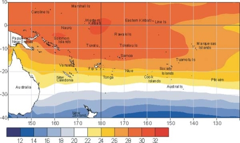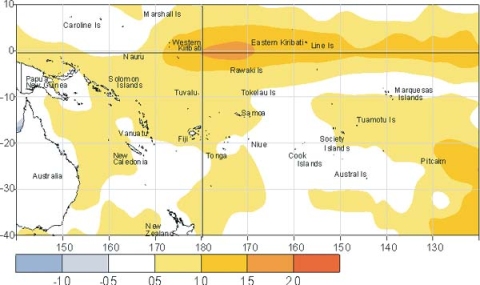 In the equatorial Pacific, a band of anomalously warm water persists about the dateline (at least 1.5°C above average).Although much of the Southwest Pacific remain about 0.5°C–1.0°C above average, there is cooling in the Coral Sea particularly north of New Zealand and around New Caledonia. A large region of warm water persists just southeast of Pitcairn Island.