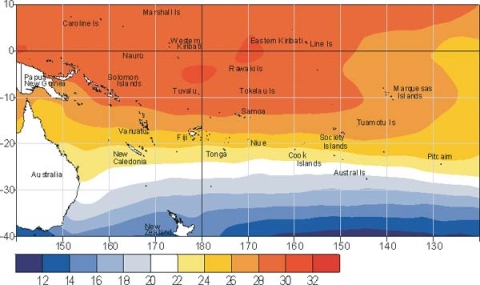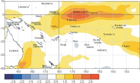 Warmer than average waters continued to affect the east coast of Australia and the region southwest of New Caledonia. The broad region of warmer than average SST between Kiribati to Pitcairn Island has now merged.