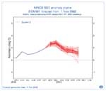 The majority of the global climate models indicate that the current El Niño conditions will weaken by the autumn of 2003. Figure 3 shows SST anomaly predictions (red lines) into the autumn of 2003, from the European Centre for Medium Range Forecasting. The thick dotted line is based on the observed SST anomaly.