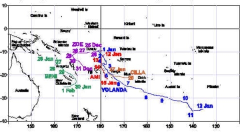 This tropical cyclone season (2002/2003) (see Figure 1 below) has been more active than past few seasons with ‘Yolande’, which did not affect any countries and ‘Zoe’ affecting Solomon Islands, Vanuatu in December 2002. January 2003 was more active with ‘Ami’ causing havoc in Fiji and Tonga, ‘Beni’ affecting Vanuatu and New Caledonia and ‘Cilla’ affecting Tonga.