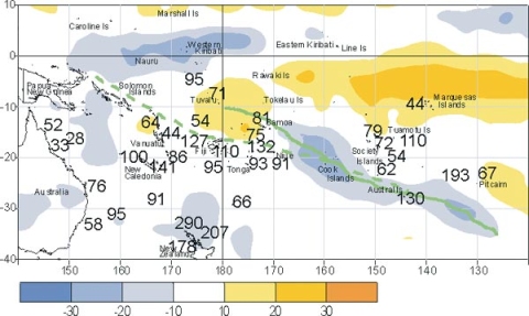 March rainfall was at least 125% of average (and more than 300 mm in places) over parts of Western Kiribati and northern New Zealand, and in a band from the Austral Islands of southern French Polynesia to the region south of Pitcairn Island. Rainfall totals were also 125% or more of average in southern New Caledonia, western and central parts of Fiji (with more than than 400 mm in some areas there), and parts of central and southern Tonga. The above average rainfall in New Caledonia was caused by the passage of tropical cylone ‘Erica’.