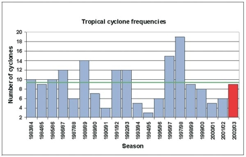 Fig 1: The number of Southwest Pacific tropical cyclones for the 2002/03 season (solid red bar) compared to frequencies during the past 20 years. The horizontal green line indicates the 20-year average.