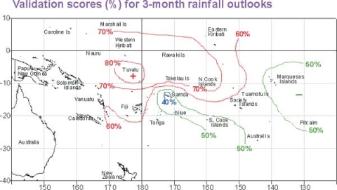 The distribution of forecast success may reflect to some extent the influence of ENSO events and the location of the SPCZ. The area near Samoa is constantly in the transition zone for SPCZ-related rainfall, making it a difficult region to predict. At this stage there is a slight indication that forecast confidence reaches a peak during the South Pacific summer, and falls to a minimum during the South Pacific autumn, but further statistics are required.