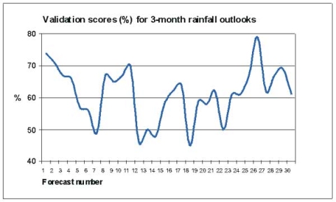 Figure 2. Validation score for 30 (3-month) rainfall outlooks. This chart shows the % of correct forecasts. Scores of 60% or more indicate significantly better outcomes than chance.