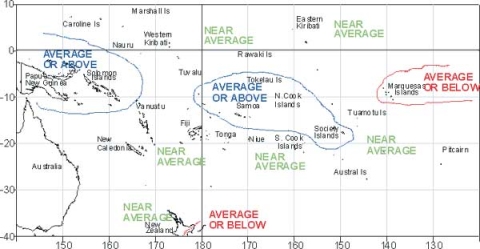 Average or above average rainfall is expected from Papua New Guinea to the Solomon Islands, also from Wallis and Futuna to the Society Islands
