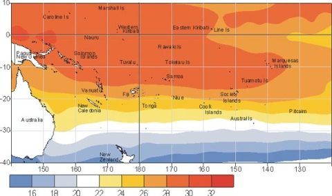 The NINO3 SST anomaly was -0.4°C in June. However NINO4 rose to +0.5°C. The three month (April – June) means were -0.4°C and +0.5°C for NINO3 and NINO4, respectively. The thermocline remains slightly elevated close to the South American coast, but is near or below its average position further west.
