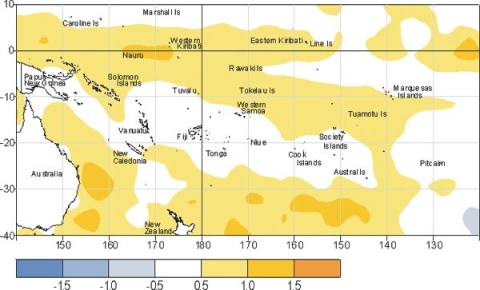 The Equatorial Pacific atmosphere and ocean have been in a neutral state for the last few months. The short-lived sea surface cooling that developed in the east during May has completely dissipated. The equatorial sea surface temperature (SST) anomalies are weak (but generally positive) right across the Pacific. The NINO3 SST anomaly has risen to +0.4°C in July (from –0.4°C in June). NINO4 rose to +0.7°C. The three-month (May–July) means were –0.2°C and +0.5°C for NINO3 and NINO4, respectively. The trade winds and OLR patterns show small anomalies across the tropical Pacific. The equatorial thermocline was depressed in the east, where a positive sea temperature anomaly has developed in recent weeks.