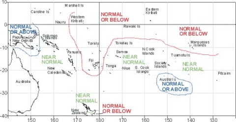 Normal or above normal rainfall is expected in Papua New Guinea and the Austral Islands Normal or below normal rainfall in the equatorial region and Tuvalu, Fiji, and the Tuamotu and Marquesas Islands