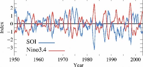 Figure shows time series of both the SOI (normalised Tahiti minus Darwin pressure difference) and Nino3.4 (using Reynolds SST, 1982-2002, concatenated to UKMO HadISST1.1, and normalised relative to 1971-2000). Visually the curves seem almost mirror images of each other, although the correlation coefficient is only –0.89. There are differences in the detail, such as the 1977/78 El Niño being much stronger in the SOI data.