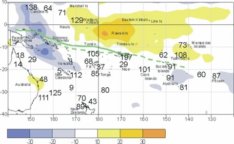 The SPCZ extended east from the north of Papua New Guinea to Samoa, being more active than usual over the Solomon Islands, and was displaced slightly north of its mean location. Enhanced convection occurred from the Caroline Islands southeast to southern Vanuatu. Apart from that region, there were only isolated areas where rainfall was at least 125% of average.