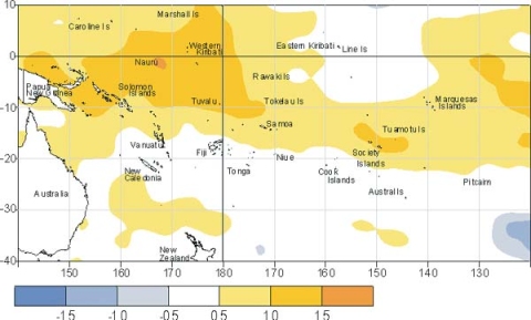 recently, but are still higher than normal, especially in the west. The mean SOI for December was +0.9, and 0.0 for October–December. The NINO3 SST anomaly for December was about +0.6°C and NINO4 is around +0.9°C (3-month means are +0.7°C and +1.0°C, respectively).