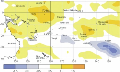 The equatorial Pacific remains in a neutral ENSO state. Anomalous equatorial SSTs continue to ease, but are still higher than normal, especially in the west. The mean SOI for January was -1.3, and -0.3 for November to January. The NINO3 SST anomaly for January was about +0.6°C and NINO4 about +0.8°C (November to January are +0.6°C and +0.9°C, respectively).The trade winds have been near normal for much of January, apart from a westerly wind burst near the Date Line in the first half of the month. The wind burst may be related to a Kelvin wave that has developed on the thermocline, with a positive temperature anomaly in the central equatorial Pacific at about 150 m, and a negative anomaly further east.