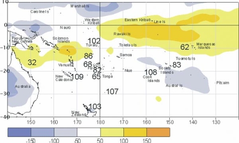 Above average air pressures in the Coral Sea suppressed convection in that area, including southern parts of the Solomon Islands, northern Vanuatu, and toward the Date Line.Suppressed convection also occurred in an extensive region along the equator from the Date Line east toward South America, including Eastern Kiribati and the Marquesas Islands (Fig. 3). The 2003 rainfall total at Willis Island (358 mm) was only 32% of average, and extremely low. Ono-i-Lau in Fiji recorded 1068 mm, 65% of average, with Hiva Hoa in the Marquesas Islands recording 751 mm, 62% of average, and one of the lowest annual rainfall totals on record.
