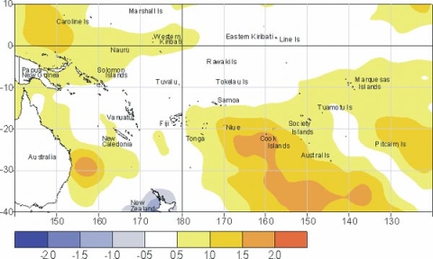 The equatorial Pacific remains in a neutral state. Equatorial SST anomalies are near zero, and have changed little from March. The monthly SOI was strongly negative, largely as a result of Madden-Julian Oscillation (MJO) activity in early April. The three month SOI (February-April) continues in the neutral range. For April and for February to April, the NINO3 SST anomaly was about +0.2°C, and NINO4 was about +0.4°C. Subsurface temperatures show negative anomalies near the surface in the eastern Equatorial Pacific, with positive anomalies in the farther west, both of which appear to be propagating east. Most of the global models indicate that neutral conditions are the most likely outcome for the rest of the year, though the chance of an El Niño developing is slightly higher than average.