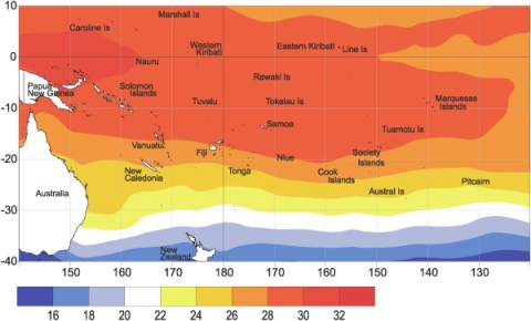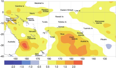 The monthly SOI rose markedly in May to +1.3 with the three month mean (March – May) close to neutral (-0.2). The oceanic and atmospheric conditions indicated a neutral phase of El Niño Southern Oscillation (ENSO) during May 2004. May SSTs were warmer than average in the western and central equatorial Pacific (NINO3 and 4 regions) and cooler than average in the eastern equatorial Pacific (NINO1 and 2 regions). Subsurface temperatures show a positive anomaly in the top 100 m in the central Equatorial Pacific, which has propagated eastwards and upwards since April. May averaged OLR anomalies show a region of suppressed convection just west of the Date Line, with weakly enhanced convection in Australian longitudes, a partial reversal of the April picture. Most global models indicate neutral conditions into spring 2004.