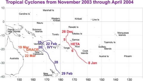 The most devastating tropical cyclone of the 2003/04 season was ‘Heta’, which originated north of Fiji on 28 December, developing into a tropical cyclone on 2 January. Heta passed west of Samoa on 5 January where high winds (145-160 km/h gusts) and heavy rainfall resulted in damage to property, crops, roads and bridges. Heta intensified further to become very destructive as its centre passed just west of Niue on 6 January, with estimated wind gusts of 275 km/h there. One person died, with several others injured, and many people were left homeless. A national disaster resulted, with considerable property destroyed, roads closed, telecommunications and electricity outages, and crops severely damaged. ‘Ivy’ formed west of Fiji on 22 February, bringing damaging winds (up to 130 km/h) and high rainfall to parts of Vanuatu on 25-26 February. ‘Grace’, originated in the Coral Sea west of New Caledonia on 19 March, but winds only reached gale force and it was rather short-lived. Strong winds and high, but not excessive rainfall affected parts of New Caledonia.