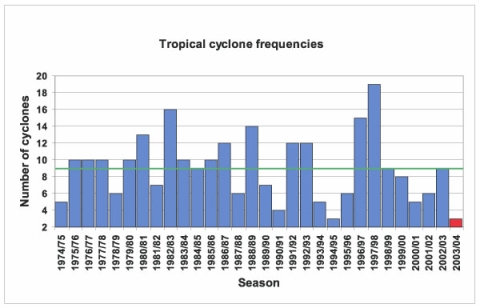 The 2003/04 tropical cyclone season had only three occurrences, being equal lowest in the last 30 years (see Figure 1). About nine tropical cyclones can normally be expected in an average season. Two of the three 2003/04 tropical cyclones reached major hurricane strength, with sustained wind speeds of at least 168 km/h. Two of the 2003/04 tropical cyclones originated west of the date line (the tracks of which are shown in Figure 2), and all occurred in the December through March period.