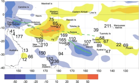 Mean air temperatures were 1.0°C above average in the Southern Cook Islands, and about 0.5°C above average in southern Tonga and Samoa. Below average mean temperatures occurred in Vanuatu.