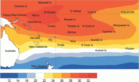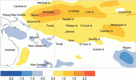 The tropical Pacific Ocean exhibited a weak El Niño state, but the atmosphere remained uncoupled from the ocean during October. The NINO3.4 average anomaly was +0.9°C again in October (as in September), and +0.8°C for August to September (up from +0.6 in July to September). The subsurface temperature profile shows a region of positive anomalies (+2°C or more) near the surface at the South American coast. Sea surface temperature (SST) anomalies have become positive right across the eastern Equatorial Pacific in the last two weeks. Positive zonal wind anomalies were evident at times during October. However, the Southern Oscillation Index (SOI) remained weak at -0.5 for October, with the August to September 3-month mean at –0.6. October outgoing longwave radiation (OLR) and the Tropical Rainfall Measuring Mission (TRMM) rainfall anomalies show anomalous convection in the region of the Solomon Islands, with suppressed convection over Southeast Asia and Indonesia. However, Southwest Pacific convective anomalies do not show El Niño-like characteristics as yet.
