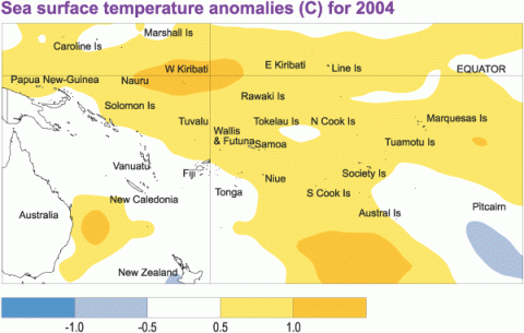 The weak El Niño event was expressed more definitely in sea surface temperature (SST) anomalies. Above average SSTs occurred throughout the region during 2004 (Figure 2), being at least 1.0 °C above average around Western Kiribati, and 0.5 to 0.9 °C above average in many other island nations, especially those east of the Date Line. New Caledonia, Vanuatu, the main island of Fiji, and Tonga, were surrounded by near average SSTs.