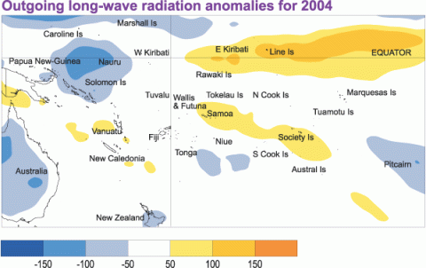 In 2004, the El Niño/Southern Oscillation (ENSO) conditions evolved from a neutral state in the first half of the year to a weak El Niño event in the central equatorial Pacific in the second half of the year (Figure 1). The trade winds were near normal in strength at the start of the year, but equatorial westerly wind bursts occurred, often reaching the Date Line, from June onwards. Apart from these (and warmer temperatures for many), the El Niño had little impact on the climate of most Southwest Pacific Islands. However, much of New Caledonia and Vanuatu, and to a lesser extent, Fiji and Tonga, had several drier than normal months toward the end of the year.