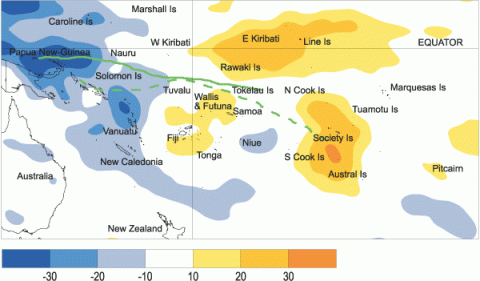 A large region of suppressed convection covered much of Indonesia and Australia. In the Pacific, regions of suppressed convection and mostly 50% below average rainfall occurred over Eastern Kiribati and parts of central and southern French Polynesia, with another, although less anomalous, area of suppressed convection over the region between Samoa, Fiji, and Tonga. Fiji’s rainfall was below average, apart from some areas in the northeast.