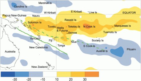 Mean air temperatures were about 1.0°C above average in Tuvalu, Wallis and Futuna, Northern and Central French Polynesia, at least 0.5°C above average in Fiji and Samoa, near average in Vanuatu and Tonga, and almost 0.5°C below average in New Caledonia.