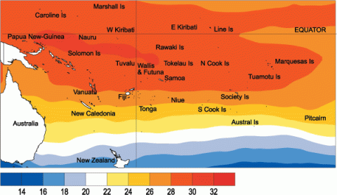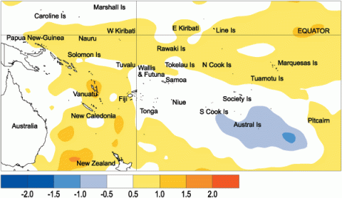 The tropical Pacific Ocean remains in a neutral but warm state (which may also be described as a weak El Niño state), much as it was in April. The rapid changes occurring in late April/early May, towards a possible El Niño state, appear to have been a short-lived perturbation. The Southern Oscillation Index (SOI) dropped slightly last month to -1.5, making the March-May mean -1.0. The NINO3 sea surface temperature (SST) anomaly rose rapidly in early May, with the May monthly average about +1.0 °C, while NINO4 was steady near +0.6 °C, and NINO3.4 was +0.7 °C. The March-May mean for NINO3.4 was about +0.6 °C. Subsurface temperature anomalies have eased in the equatorial Pacific, after a large positive anomaly surfaced in the east from late April. A significant Madden-Julian Oscillation (MJO) event came through the western Pacific in the first half of May, associated with positive surface zonal wind anomalies and a small rise in SST anomalies.
