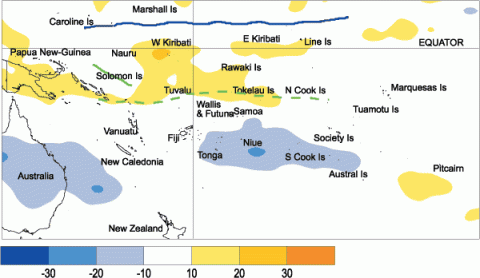 Anticyclones in the eastern Tasman Sea produced above average mean sea-level pressures over New Caledonia and Vanuatu. Pressures were below average over French Polynesia and the Cook Islands.