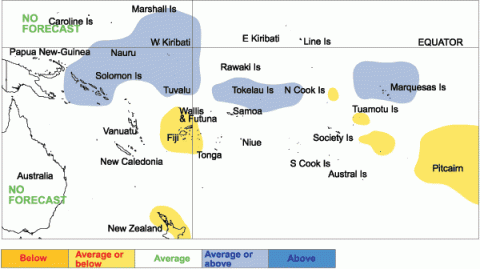 Rainfall is forecast to be near or below average for Fiji, Tuamotu Islands of French Polynesia, and Pitcairn Island. Near average rainfall is expected over the rest of the islands in the region.