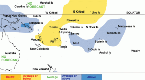 Enhanced convection is likely over the Solomon Islands, where rainfall is expected to be above average. A region of near or above average rainfall is expected over Papua New Guinea. Another region of near or above average rainfall extends from the Marquesas Islands west to Samoa including the Tuamotu Islands, the Southern Cook Islands, and Niue.