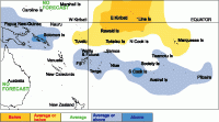 Another large area of near or above average rainfall is expected from Papua New Guinea east to southeast to Pitcairn Island including Wallis and Futuna, Samoa, Fiji, Tonga, Niue, the Austral Islands, and the Tuamotu Islands.