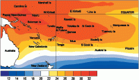 Tropical Southwest Pacific mean sea-level pressures continued the tendency to be below average east of the Date Line, being 2 hPa below normal over the Southern Cook Islands. They were above average in the Tasman Sea. Equatorial surface easterlies were persistent along the equator, occurring in about 85% of observations at Tarawa.