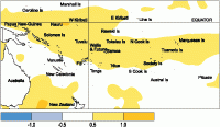 Above average SSTs occurred throughout much of the tropical Southwest Pacific during 2005 (Fig. 2), being about +1.0 °C above average around Western Kiribati, and at least +0.5 °C above average in many other island nations, especially those north of 20 °S. New Caledonia, the Southern Cook Islands, the Austral Islands, and Pitcairn Island were surrounded by near average SSTs. Southwest Pacific island surface air temperature anomalies for 2005 were consistent with the SST anomalies throughout the region. It was an extremely warm year in Tahiti-Faaa, central French Polynesia, where the mean temperature was 27.0 °C (+0.8 °C above the 1971-2000 normal), and equal highest since measurements commenced in 1957.