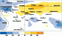 Southwest Pacific 2005 OLR anomalies (Fig. 3) showed a region of enhanced convection over Papua New Guinea extending towards the Solomon Islands. There was also an area of weakly enhanced convection over Niue and the Southern Cook Islands, as well as Pitcairn Island. Convection was suppressed in 2005 over Western and Eastern Kiribati, Tokelau, Tuvalu, Wallis and Futuna, the Northern Cook Islands, and the Marquesas Islands. The year’s rainfall distribution indicates similarities to the OLR pattern. However, for rainfall there were not many significant anomalies. Rainfall was at least 110% of normal affecting a region extending from Niue to north and east of Fiji, and also parts of southern French Polynesia. In contrast, rainfall was less than 90% of average throughout much of New Caledonia.